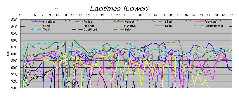 reliability which can carry out a pace rise in the end When Massa of 2 stops had run the whole distance, what place was it? It was whether to have reversed to Sato's 3 stop eye. With a quite dangerous match, Sato was regarded as it being a front with it being small. Button and Sato did not carry out a pace down like a top team to the 4th stint. You may conclude that there is enough reliability of Honda engine. As for Pantano, the difference with Heidfeld did not spread in the middle stage. It could be said that this was done well. However, it was passed by the 2nd lap at Bruni and passed by the 4th lap at Klien. A subject is in a run of the opening part. |