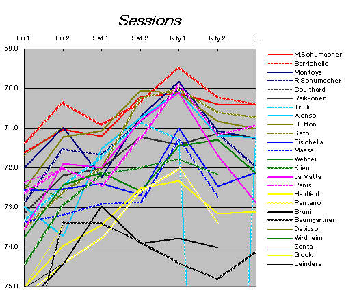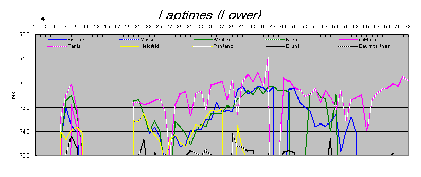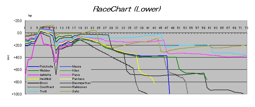 | 今回のオーバーテイク 6周目 クルサードがウェバーを追い抜いて9位 6周目 モントーヤがバウムガートナーを追い抜いて13位 6周目 フィジケラがバウムガートナーを追い抜いて14位 7周目 モントーヤがハイドフェルドを追い抜いて12位 10周目 ダ・マッタがバウムガートナーを追い抜いて13位 20周目 ウェバーがバウムガートナーを追い抜いて13位 26周目 佐藤がウェバーを追い抜いて10位 27周目 佐藤がクルサードを追い抜いて9位 29周目 佐藤がフィジケラを追い抜いて8位 30周目 佐藤がハイドフェルドを追い抜いて6位 31周目 ライコネンがウェバーを追い抜いて10位 40周目 佐藤がパニスを追い抜いて4位 41周目 ライコネンがハイドフェルドを追い抜いて10位 51周目 ライコネンがクルサードを追い抜いて8位 58周目 ライコネンがウェバーを追い抜いて6位 62周目 佐藤がトゥルーリを追い抜いて3位 |