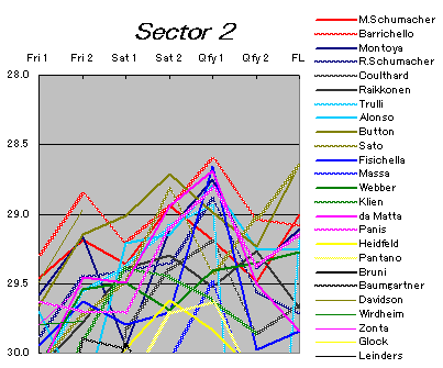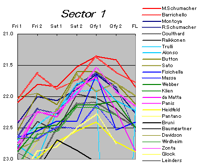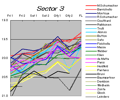 where Ferrari is strong Ferrari showed predominance the main straight back in the section where a low-speed corner succeeds one another. Although BAR was a little inferior, it ranked second to Ferrari. That Toyota was good in this section may be able to have expectation in second half of the season. |