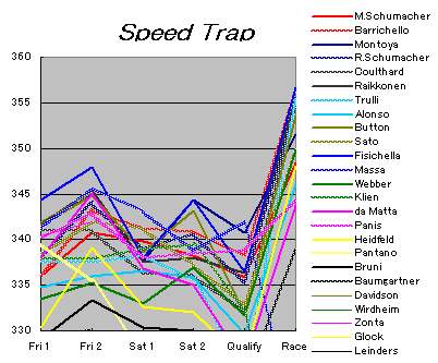 increased in the race The speed of a speed trap point increased by leaps and bounds in the race. Although it was unclear by a diagram, the highest was 356.6km/h of Fisichella. Incidentally, Michael recorded h in 368.8km/h in 2003 Italy GP. Since BAR raised the down force by the example, it was not a top. But it turns out that Sato has speed higher than a qualifying on all measurement points. |