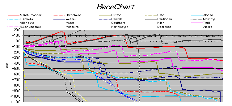 M・シューマッハは第一スティントこそ1:21秒台で走ったが、第二スティント以降はジリ貧になった。一方、ライコネンは第三スティントでも1:21秒台を連発する力があった。圧巻は38周目のアウトラップの速さと、40周目のファステストラップだった。ライコネンはモントーヤより1秒速かったため、モントーヤが止まらなかったら追いついていただろう。先にピットインしても逆転した可能性がある。ドライバーの気迫が見えたレースだった。