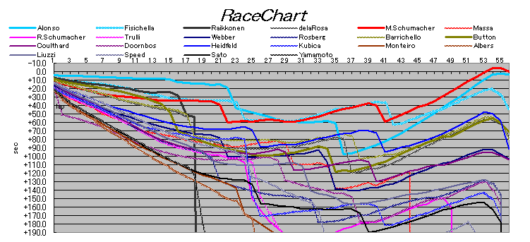 M・シューマッハとアロンソ、どちらに心理的余裕があるかが勝敗に響いた。アロンソは序盤に磨耗させるほど走らなければタイヤ交換せずに走れ、かつM・シューマッハの追い上げを抑えていたかもしれない。アロンソは焦りが感じられるので、残り2戦は落ち着いて考えた方がいい。今回のような大量リードは必要なく、相手より前にいればいい。
