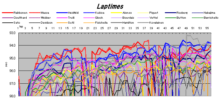 クビサの第1スティントはフェラーリ勢に遜色なかったが、燃料がフェラーリ勢より3〜4周分軽い。ハイドフェルドはマッサと同じ燃料で離された。