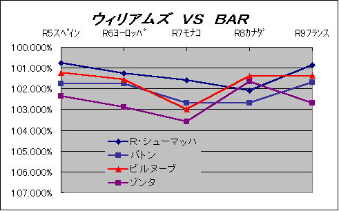 PPタイムを100%として、各選手のPPタイムとの比率をグラフ化しました。1%が約1秒に相当。ライバルチームごとに推移を見ます。