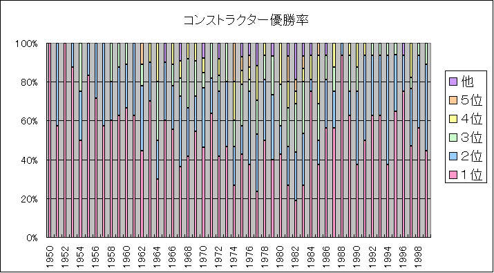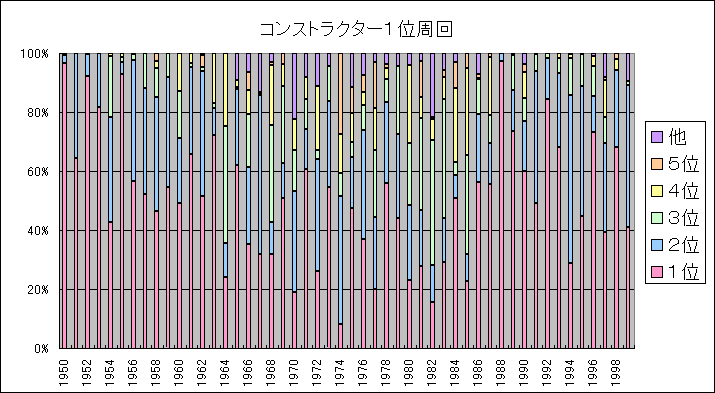 ピンク色がその年のコンストラクターズ王者がとった1位周回率で、水色が2位チームの1位周回率、薄緑が3位チーム・・・です。1950〜1957年はコンストラクターズタイトルがなく、計算上の順位です。