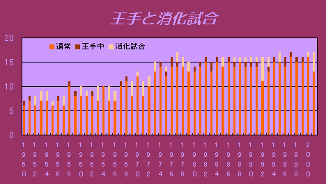 1950年から2001年まで、王手がかかっていないレース数(橙色)、王手がかかったが決まっていないレース数(茶色)、決定後の消化試合(薄黄色)数です。