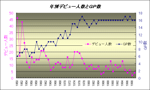 GP数が1950年代の年平均8戦に対し、1990年代は16戦と倍増しているのと対照的です。