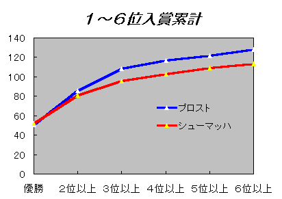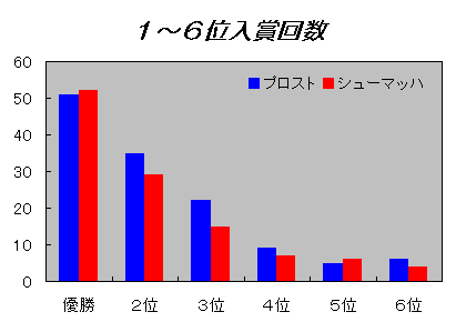 最後に、ふたりの入賞順位ごとの回数を並べました。右は順位ごとの回数で、左は累計です。シューマッハは、優勝回数ではプロストを抜きました。しかし、2位以下の回数ではプロストを下回っています。プロストが強いライバルたちと戦ってきたということは、その分、優勝回数が少なくなり、2位や3位の数が多くなることになります。逆に、シューマッハはライバルが少ないからプロストより楽に優勝でき、2位以下は少ないと言えます。