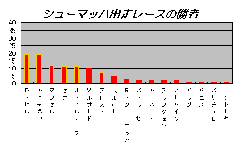 プロストとシューマッハが出走したレースでの、勝者を回数順に左から並べました。比べて分かるのは、プロストに大きく立ちふさがったセナの存在です。プロストはセナに37回の優勝をさらわれました。セナは全盛期をプロストと戦いました。セナはシューマッハが伸びた時期に姿を消しました。そして、それ以降、シューマッハにセナほどの強敵は現れていません。(ハッキネンは20勝だが、シューマッハ欠場時の1勝を除外)