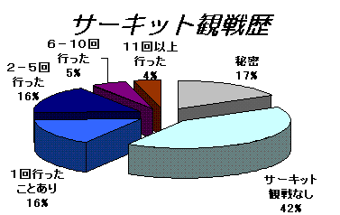 サーキット観戦歴では、一度もない方が4割以上になりました。テレビやネットで何でもわかる時代ですね。それにサーキットまで出向くのは大変です。チケットは高いし、雨降るかもしれないし、トイレは並ぶし、サーキット内はやたら歩かされますからね。テレビは何台ものカメラが切り替わりながらずっと1台を映してくれます。サーキットは、自分の目の前を数秒で通り過ぎて、また1分半待つという感じです。しかし、臨場感、2台の差の感覚、そして、何と言っても、音の迫力がテレビで味わえないことです。ぜひ、一度行ってみる事をお勧めします。