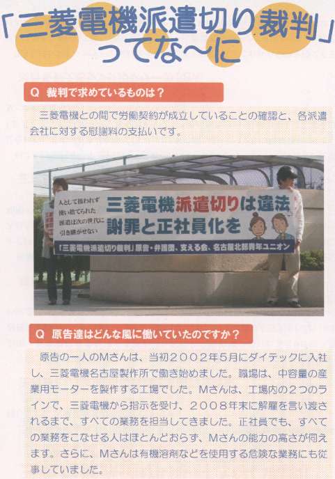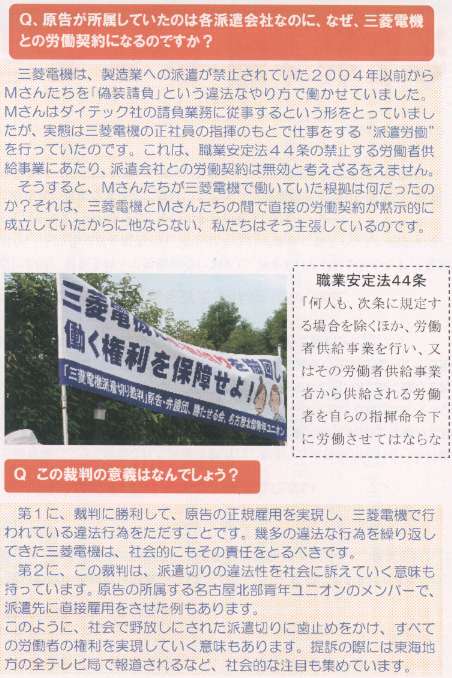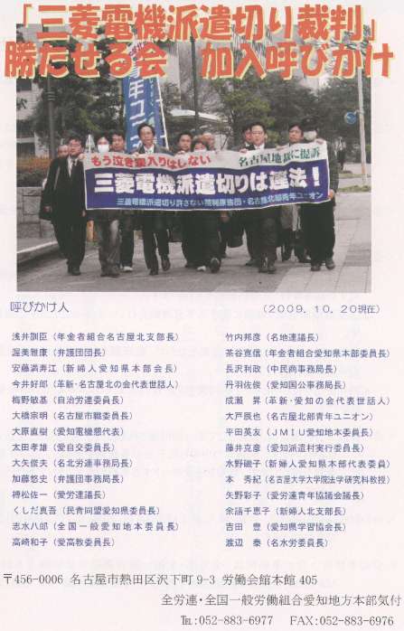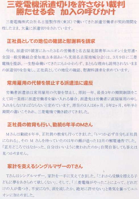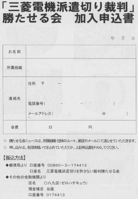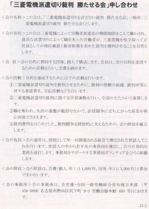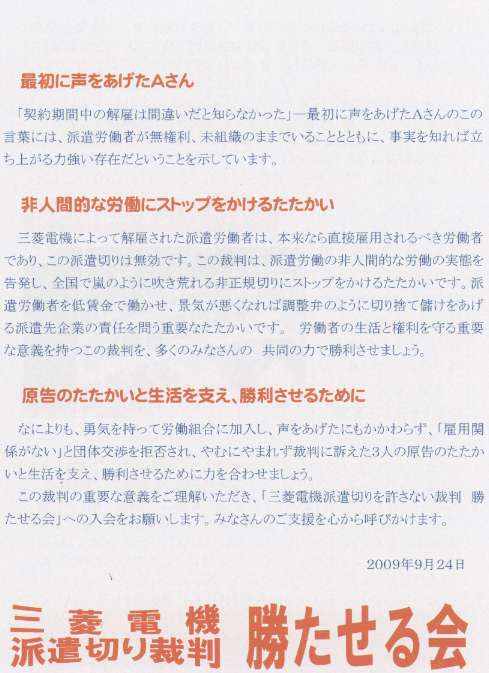 「三菱電機派遣切り裁判」勝たせる会 への加入を呼びかけるパンフレットです。