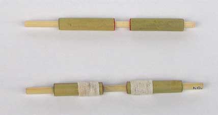 ・古い編み棒を使う 8号(直径4.5o),9号(直径4.8o)、10号(直径5.1o)。 ☆ 花びらを押すパイプ ・篠竹で作る 篠竹の穴が棒にピッタリと合う場所を探して数pの長さに切る。 ピッタリと合う部分を探すのが大切であり、探すのに苦労する。 新聞紙2枚分の厚さより隙があると花びらの端が棒との隙間に入り皺が押せない。 しかし、篠竹は自然の材料でありキッチリと合うサイズのものは見つけ難く、 根元から先端に向けて細くなっている。 また、ひとつの節の間でも中央部が太く節の近くは細くなっている。 このため、手頃なサイズが見つかっても、一本の篠竹から得られるのは1〜2組である。 ・パイプの先端には糸を巻き補強する 篠竹は割れやすいので糸を巻いて補強する、押すとき指が掛かり滑り止めにもなる。