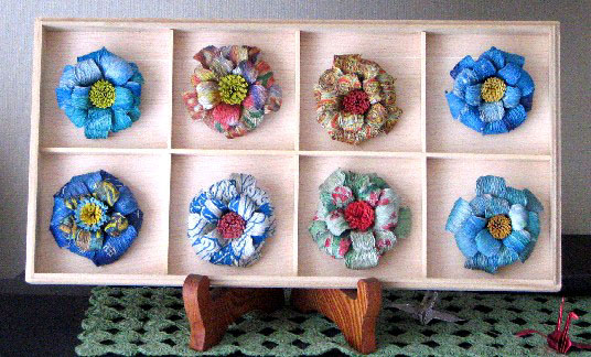 新聞紙の広告などで気に入ったカラーページを見つける度に保存しておき、時間の余裕のある時コサージュ作りをすると、いつの間にか沢山の気に入った作品がたまります。 複数のコサージュを集めて壁掛けや置物にしてみました。 古新聞を材料に作ったのですから置物の台も廃物を利用しました。 ここで紹介するものは乾麺や素麺の空き箱を使った収納兼壁飾りです。 100円ショップやホームセンターで薄い板を買って間仕切りを作り、マジックテープで気に入った コサージュを留めてみました。 壁に吊すとインテリアとしても合格です。 マジックテープで留めたので簡単に外すことも出来ます。その時の気分や洋服に合わせて壁飾りから外して使うこともできます。 収納場所も兼ねることもできるのです。 いかがでしょうか。