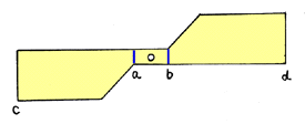 (1)竹材を裏返しして図3を参考に進める(2)竹の裏側からa、bの位置にノコギリで切り込みを入れる。竹の表面側に1ミリほど肉を残す (3)竹を立てて、cからaに向かって割る、次にdからbに向かって割る (4)図4に横から見た加工後の形を示す。薄い色の部分を取り除くことになる
