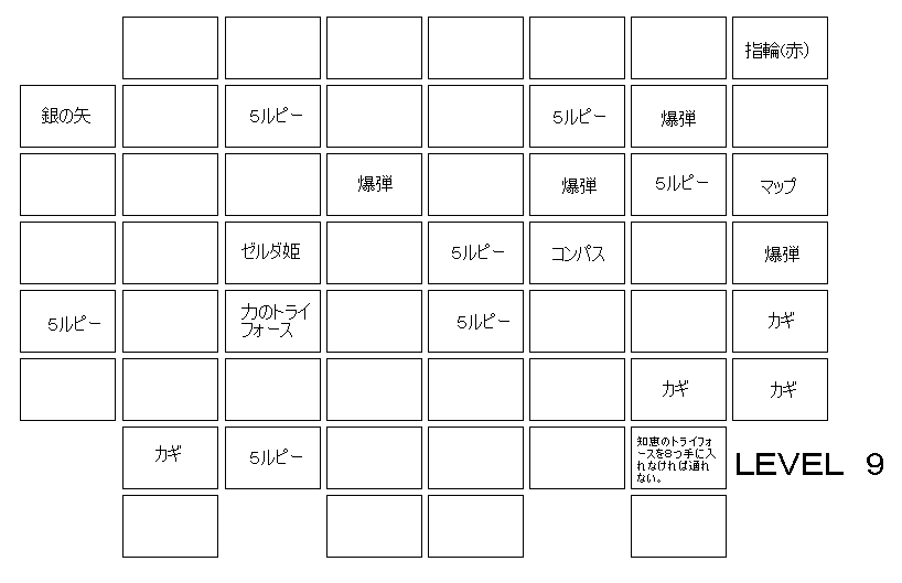 | LEVEL8と同様に宝物が2つある。防御力アップの指輪(赤)。ガノンと戦う時に必要な銀の矢だ。 |