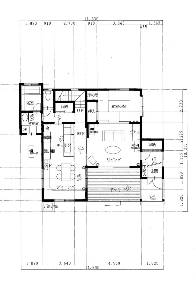 玄関を少し小さくして収納を増やしています デッキも少し小さくなっています 階段部分にあった地下への階段を収納にしています 浴室の窓を北側に設けました ピアノを置くスペースを書き込んであります 変更部分は以上です