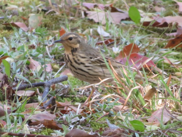| この冬、3羽のビンズイが公園に来ました。ツィ、ツィと鳴きながら、地面で餌を 探しています。尾を上下に振り、首を前後に忙しく動かして歩き回ります。逃げる ときだけ木に止まります。 |