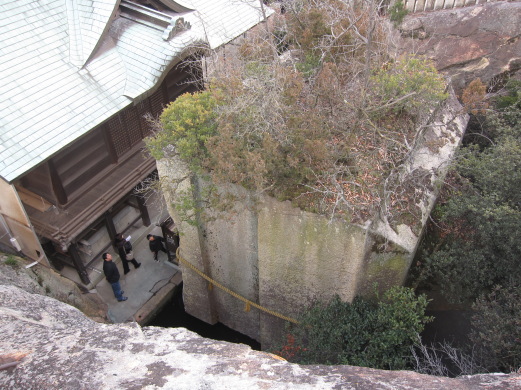 左右と裏側の三方より岩壁が迫っています。周囲の岩が掘り除かれ、真ん中に石の宝殿を掘り残すというように造られているのです。岩の底も削りこまれていて、まるでその下の池に浮いているように見えます。