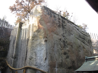 高砂市、生石神社……。石段を上り、割り拝殿の中をくぐり抜けると、石の宝殿が目の前に大きく立ちはだかりました。岩の大きさは、一辺が約6m。正面は平らですが、左右には幅1.6mの溝が縦に掘られています。また、背面は屋根型に中央部が突き出しています。