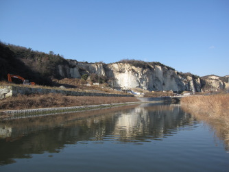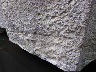 堆積するときに層をつくりますが、石の宝殿でもそれが縞模様となってうっすらと見えます。右の側面の下部に、そのように成層したようすがはっきりと表れています。