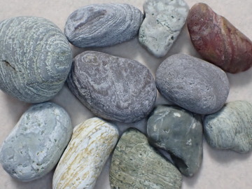 2.香住浜の小石 白っぽいものが多いのですが、赤紫色や緑色・黄土色を帯びたものもあります。 流理による縞模様をルーペで観察すると、湾曲や膨縮などが見られます。石英と長石の斑晶が観察できるものと、それらの斑晶が見られないものがあります。 写真右上の赤い石は、ジャスパーです。流理のある流紋岩が、そのつくりを残したままジャスパーになっています。 流紋岩は、主に矢田川層群の地層に由来すると思われます。