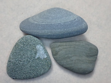 灰色あるいは淡褐色の中粒~細粒砂岩です。写真中央や右下の砂岩のように葉理の見られるものがあります。葉理では、大きな粒子が白っぽい層、小さな粒子が黒っぽい層をつくっています。左下の砂岩には、方解石脈の一部が張りついています(白いところ)。 砂岩は、泥岩と同じように北但層群あるいは照来層群の地層に由来するものと思われます。
