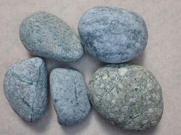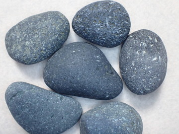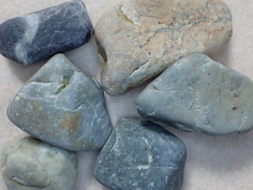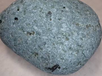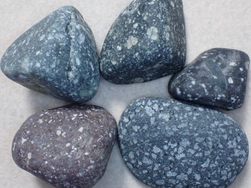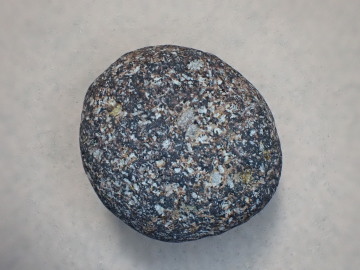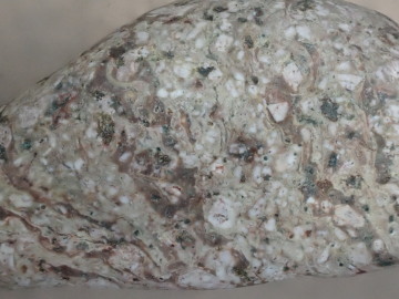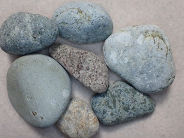 多くが暗灰色ですが、酸化によって赤くなっているものもあります。石の表面に目立つ白い斑点は、斜長石の斑晶です。角閃石あるいは輝石と思われる有色鉱物がふくまれています。 デイサイト~安山岩は、溶岩として産出したものが多いようですが、火山灰や火山礫などの火山砕屑物が固まった火砕岩として産出しているものもあります。火砕岩には、同質の岩石片がふくまれていることがあります。