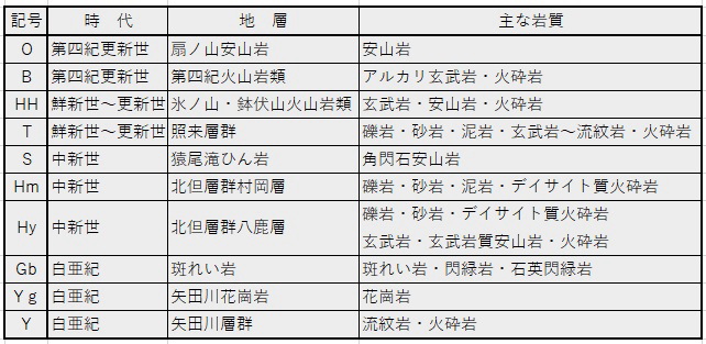 緑灰色で、長柱状の角閃石の斑晶をふくんでいます。矢田川の支流、作山川にかかる猿尾滝で見られるので、「猿尾滝ひん岩」と呼ばれていました。 「玢(ひん)岩」は、斑状組織を示す閃緑岩組成の半深成岩を示す岩石名ですが、近年は使用されず安山岩にふくめられています。 作山川に分布するこの岩体は、長らく「岩脈」とされていましたが、マグマが地層を押し上げて餅のようにふくらむ「ラコリス」と呼ばれる形状であることがわかりました(羽地・山路 2017)。