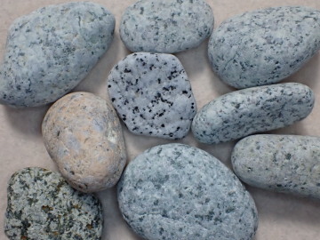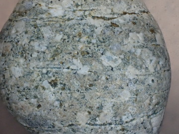 中粒~細粒の花崗岩~花崗閃緑岩で、岩石全体が白っぽく見えます。ピンク色のものは、ピンク色のカリ長石を多くふくんだ花崗岩です。 この花崗岩~花崗閃緑岩は、後期白亜紀の矢田川花崗岩です。