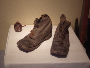 図書館の二階に「加藤文太郎山岳記念室」がある。階段を上がると、槍ヶ岳をバックにした加藤のレリーフが迎えてくれる。 山岳記念室には、加藤が使った登山用具や登山手帳、山で撮った写真、槍ヶ岳での遭難を伝える当時の新聞、これまでに発刊された「単独行」など、加藤にまつわるものが展示されている。 登山靴は牛革製で、長さ28.5cm。靴底は厚く、本体との間ははがれないように金属で補強されている。スキーをはいたときの跡も溝となって、全面や側面に残されていた。 カメラはドイツ製。飯盒の横にあるのは、登頂記念のスタンプを押した扇子。5つ、6つのスタンプが押されているが、インクの色が消えかかっていてどこの山かはわからなかった。