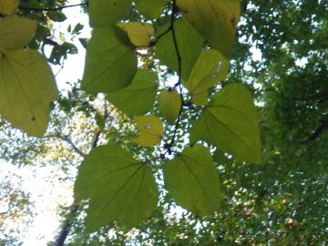 ケヤキのまだらに染まった葉が陽を透かし、その下でクロモジの葉も黄色になっている。クロモジの小枝を折って、二人でにおいをかいでみた。
