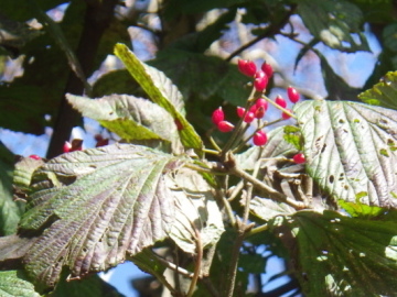 その赤い実がガマズミの実で、白い粉をふくようになると甘くなって鳥が食べにくることなどを教えてもらった。実をつまんで口に入れてみると、はじめ少し甘くて、そのあとしばらく苦みが残った。