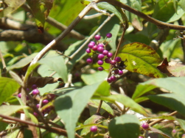 ムラサキシキブが実をつけていた。シロダモは、花と実が同時。