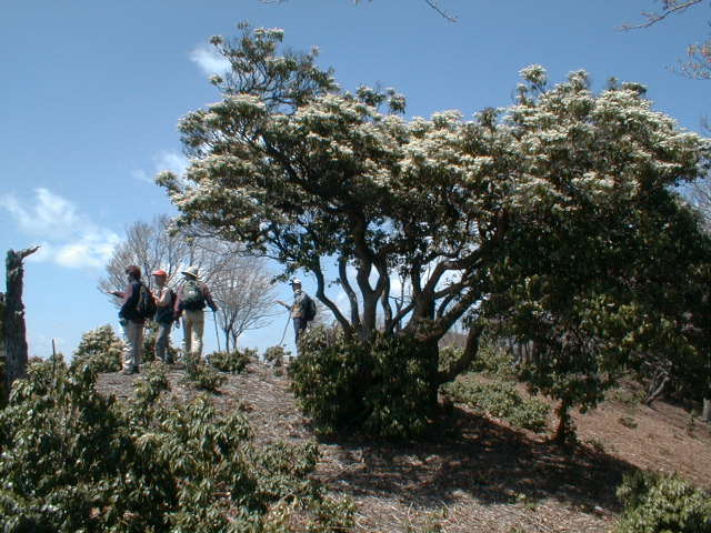 白い花を群とつけたアセビの大きな木の下に、高星山の三角点は立っていた。その木の下に、一人二人と辿り着く。その向こうには、澄んだ青い空とその下に広がる峰山高原から砥峰高原。思えば、アセビの花の咲く頃に高星山へと誘われてここまで来たのであった。