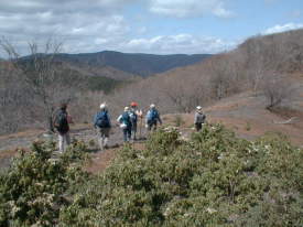 高星山から平石山、ヒシロガ峰へと稜線を歩く。咲き誇るアセビの林の中を、コナラ・クリ・クヌギのふかふかの落ち葉を踏んで歩いていった。シダはまだ冬枯れ、ササの葉は見事に鹿に食われている。一面褐色の世界の中に、緑はアセビの葉だけ、白はアセビの花だけ……。時々、黒土が顔を出しているところがある。小さなスミレの花がそんなところに咲いていた。ヒシロガ峰(1042m)山頂の手前が、最後の登り。木の幹の間に青い空が見えてくる。ヒシロガ峰から、みんなで周囲の山々を見渡す。「こんな世界が日本にあったのかという風景」と島田さん。今日、何度こうやって周囲の山々を眺めたことか。