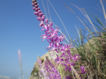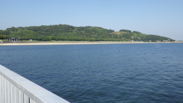 分岐を左にとって坂道を登り、クヌギの木をくぐると、広い草地に出た。吹流しのたなびく、パラグライダーの基地である。 目の前に瀬戸内海が広がっている。遊漁センターの桟橋が海に伸び、その右に小赤壁三山が海に向かってたたずんでいた。