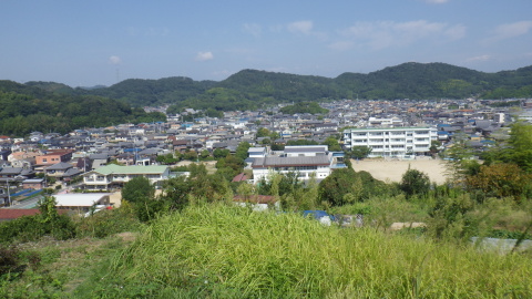 突き当たった竹林の中に道が続いていた。下っていくと、先ほど分かれた道と合流した。林から畑に飛び出したところに、大きなクスノキが立っていた。 ここから下に、山に囲まれた的形の街が見下ろせた。ここが向山の北の肩にあたるところで、泊山と呼ばれているところ。 小学校のグランドで遊ぶ児童たちの姿が見え、そこから歓声が上ってくる。あそこからこの山を見ると、きっとここがてっぺんに見えるのだろう。