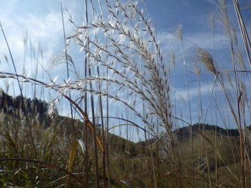 道は尾根を通らずに、斜面をトラバースするようにススキの中に伸びている。澄んだ空に、巻雲が浮かんでいた。道は細く、人とすれちがうときは、どちらかが脇によけて道をゆずった。