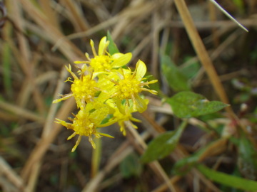 ススキの間から、下を見下ろせるところがあった。小さな池に、青空がくっきりと映っていた。岩の下に、アキノキリンソウを見つけた。そばには、センブリが咲いていた。