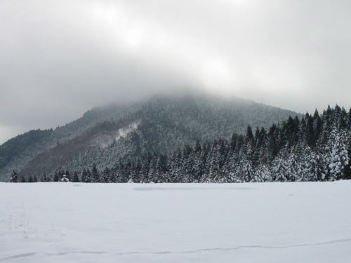 時折、雲の影が高原の上を足早に通り過ぎていく。高原のその先には、千町ケ峰、段ケ峰、平石山、1067m峰、高星と、新雪をまぶした山々の稜線が、ゆるやかな曲線を描いている。1067m峰山頂の雪はまばゆく輝いていた。