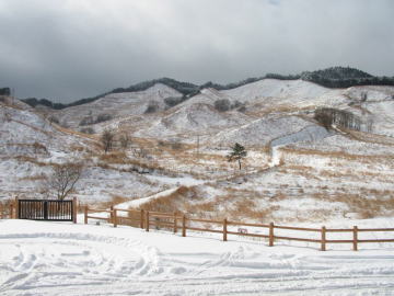高原は、この二日間に降った雪でおおわれていた。雪から顔を出した枯れススキが、うす褐色の小さな斑点模様を雪の白につけていた。