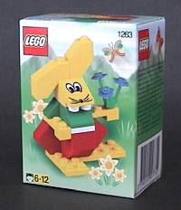 1263 のパッケージ(外箱)の中身です。卵型チョコ5個とウサギ型チョコが大小各1個、そしてレゴのセットが一つが入っています。1264 も同じ構成です。 |