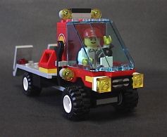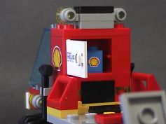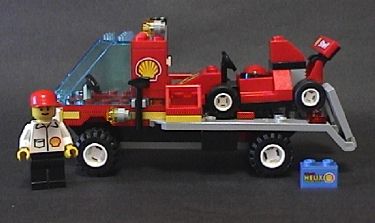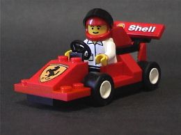 mini-fig 1体付き。F1 フェラーリと運搬用トラック。トラックのロゴ類はステッカー。フェラーリのエンブレムはプリント。手前の青いパーツはオイル缶(ラベルはステッカー)。 シェルのセットではお馴染み、フェラーリのマシン。カーキャリアの運転手が F1 マシンも運転します。 |