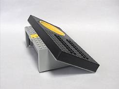 ほかにトレイン専用部品として、やはり車輪が必須です。上で挙げたモーターではない、動力を持たない車輪です。これらを車体ベースプレートの穴に差し込んで、車体を作ります。実際に差し込んでみると、ベースプレートの枠の部分に当たることで、必要以上に車輪のユニットが回転しないようになっていることが分かります(カーブレールに沿った角度がほぼ限界)。 |