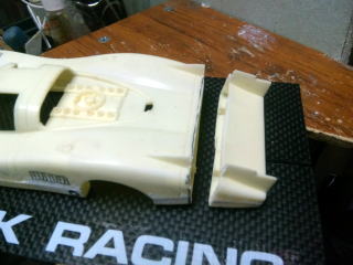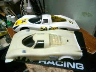 奥以前に製作したユニオンの908です、手前今回製作中のミツワのポルシェ908です大きさが同じくらいです。巾があります,