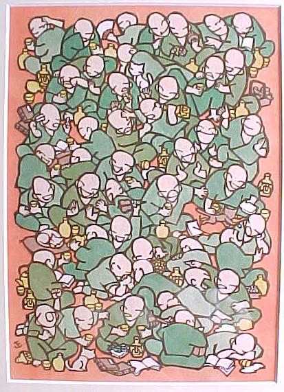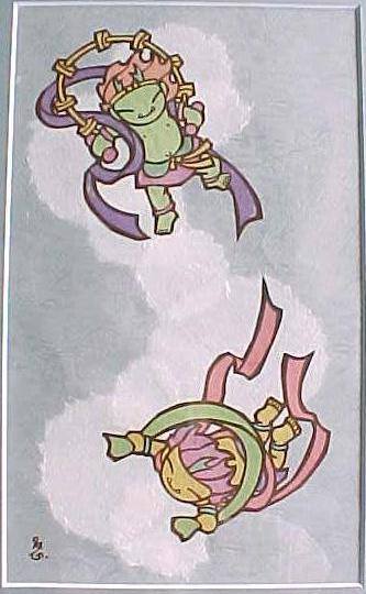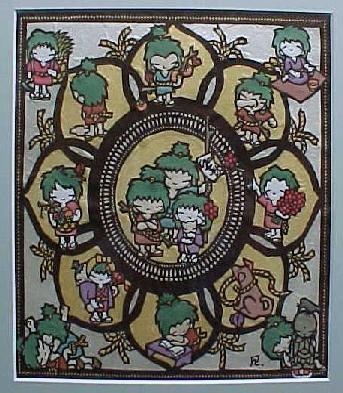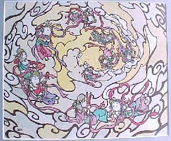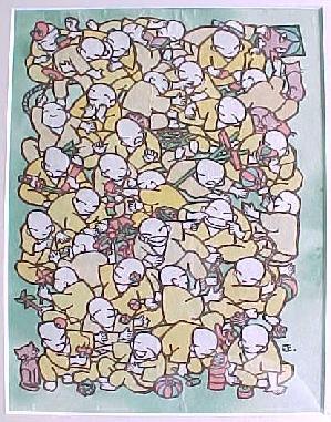 | 出会った夜の酒の席で、いつかぼくの寺の本堂で個展をしようという話で盛り上がりました。 その個展は1999年の秋、 長谷寺の大法会のプレイベントで開催されました。 上の「ほろよい羅漢」と対をなすのがこの「遊び羅漢」。 この2枚はぼくの「両界曼荼羅」です。 |