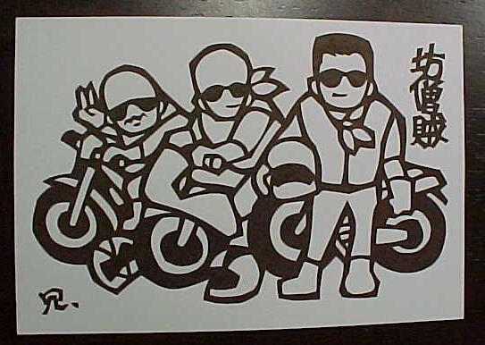 | 時々こういう作品を送ってくれます。 鳴門の名産の梨を送って、 坊主仲間の分け前ですって添えたら、 このきり絵が届きました。 ぼくらみたいなやくざな坊主は、 山賊や海賊みたいなもんじゃなかろうか。 左が雨宮さん、真ん中は仙台の須永和尚で、 右の一番お坊さんらしくないのがきっとぼくです。 この作品は、「百日紅」31号に掲載されています。 |