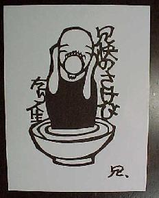 雨宮冗快さんは埼玉県松伏町在住のきり絵作家です。 仙台の須永晃仁和尚の紹介で知り合い、いっぺんに彼の作品が好きになりました。 鮮明な写真でないのがとても残念ですが、これは初めて譲ってもらった「おいでおいで」という作品。 どうしても欲しいという人が幾人かいたので、実物は無理だから写真にしてあげたら、どこの家でも幸運を呼ぶ絵になっているみたいです。 |