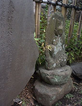 八王子市台町 信松院 「歯の塚探訪」からは離れるが,調べものをするために図書棺で資料を漁っていたら,八王子にも歯に関する碑があることが判った. 境内の北西の隅に「武田信玄公息女松姫君御手植ノ松」という碑の右に頬をおさえている小さな石仏がある.江戸時代初期にまつられたといわれ,この仏様におまいりすると歯の痛みが直るという. 右の頬をおさえているが,表情はよくわからない.