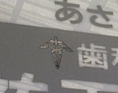 S歯科(JR八王子駅,八王子市)(1999.7.7) 駅の看板です.一見してトリですが,下のほうはヘビと杖を思わせるデザインです(杖のヘッドが鳥なのか?).最初トリの項に入れていたやはりこれはヘビでしょう,ということで引っ越しました. (2000.09.23)